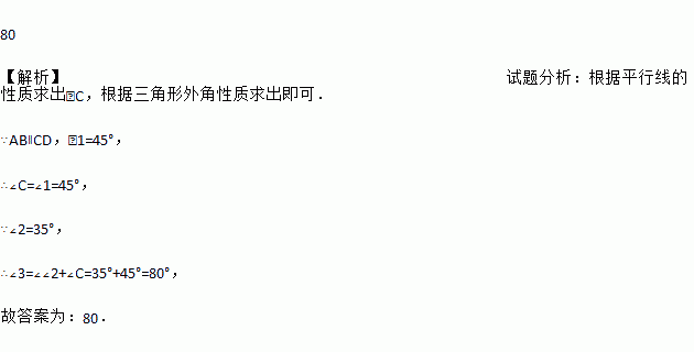 如图,直线AB,CD被BC所截,若AB∥CD,∠1=45°,∠2=35°,则∠3= 度.