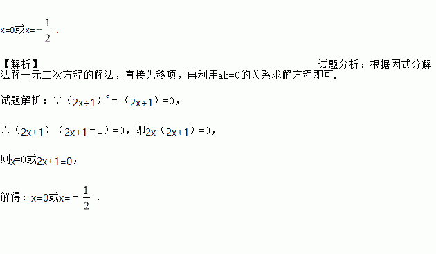 x=0或x=. 【解析】试题分析:根据因式分解法解一元二次方程的解法,直接先移项,再利用ab=0的关系求解方程即可. 试题解析:∵(2x+1)2﹣(2x+1)=0, ∴(2x+1)(2x+1﹣1)=0,即2x(2x+1)=0, 则x=0或2x+1=0, 解得:x=0或x=﹣.