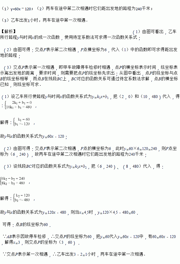 甲、乙两辆汽车沿同一路线赶赴距出发地480千米的目的地,乙车比甲车晚出发2小时(从甲车出发时开始计时),图中折线OABC、线段DE分别表示甲、乙两车所行路程y(千米)与时间x(小时)之间的函数关系对应的图像线段AB表示甲出发不足2小时因故停车检修),请根据图像所提供的信息,解决如下问题:
