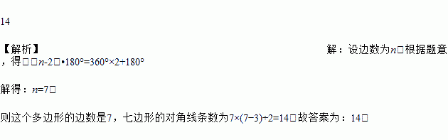 14 【解析】【解析】 设边数为n,根据题意,得:(n-2)•180°=360°×2+180° 解得:n=7. 则这个多边形的边数是7,七边形的对角线条数为7×(7?3)÷2=14.故答案为:14.