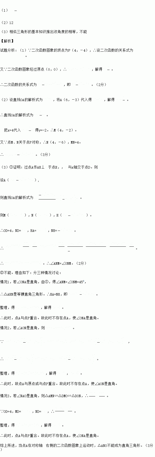 (1) (2)12 (3)相似三角形的基本知识推出该角度的相等,不能 【解析】 试题分析:(1)∵二次函数图象的顶点为P(4,-4),∴设二次函数的关系式为。 又∵二次函数图象经过原点(0,0),∴,解得。 ∴二次函数的关系式为,即。(2分) (2)设直线OA的解析式为,将A(6,-3)代入得,解得。 ∴直线OA的解析式为。 把x=4代入得y=...