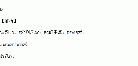 如图,AB是池塘两端,设计一方法测量AB的距离,取点C,连接AC、BC,再取它们的中点D、E,测得DE=15米,则AB=( )米.