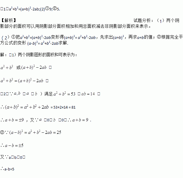 (2)如果图中的a,b(a>b)满足a2+b2=53,ab=14,求:①a+b的值; ②a-b的值.