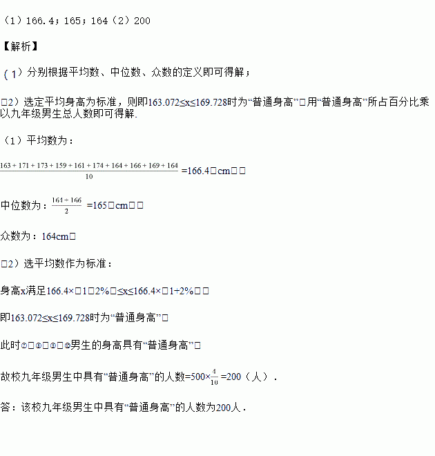 规定:身高在选定标准的±2%范围之内都称为“普通身高”.为了解某校九年级男生中具有“普通身高”的人数,我们从该校九年级500名男生中随机选出10名男生,分别测量出他们的身高(单位:cm)收集并整理统计表: