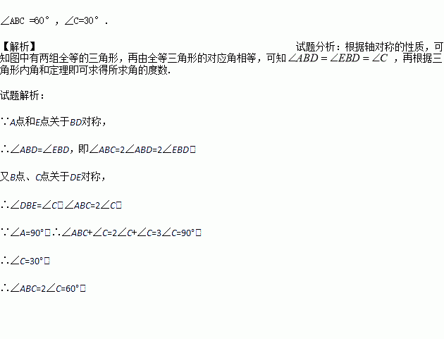 如图,∠A=90°,E为BC上一点,A点和E点关于BD对称,B点、C点关于DE对称,求∠ABC和∠C的度数.