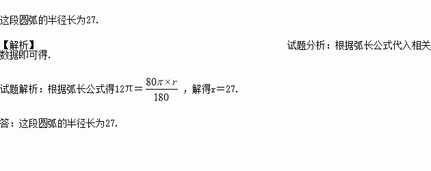 如图所示,有一段弯道是圆弧形的,弯道长12π,弧所对的圆心角是80°,求这段圆弧的半径.