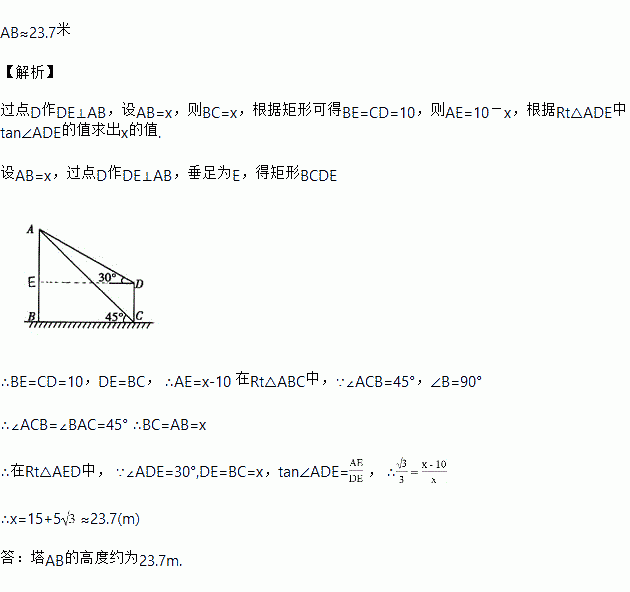 为了测量某风景区内一座塔AB的高度,某人分别在塔的对面一楼房CD的楼底C、楼顶D处,测得塔顶A的仰角为45°和30°,已知楼高CD为10m,求塔的高度。(结果精确到0.1m)(参考数据