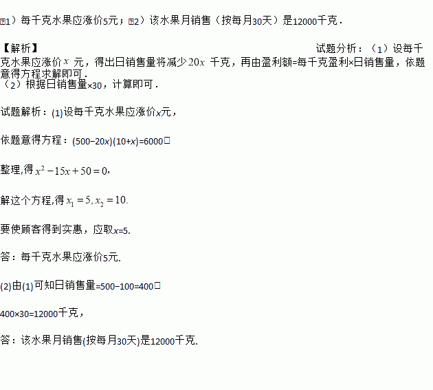 (1)每千克水果应涨价5元;(2)该水果月销售(按每月30天)是12000千克. 【解析】试题分析:(1)设每千克水果应涨价元,得出日销售量将减少千克,再由盈利额=每千克盈利×日销售量,依题意得方程求解即可. (2)根据日销售量×30,计算即可. 试题解析:(1)设每千克水果应涨价x元, 依题意得方程:(500?20x)(10+x)=6000, 整理,得 解这个方程...