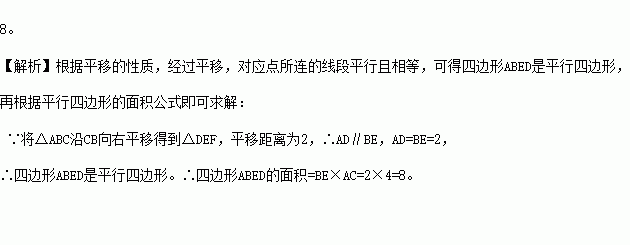 如图,在Rt△ABC中,∠C=90°,AC=4,将△ABC沿CB向右平移得到△DEF,若平移距离为2,则四边形ABED的面积等于 ▲ .