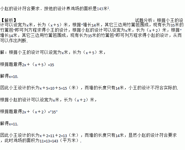 一个长方形的养鸡场的长边靠墙,墙长14米,其他三边用竹篱笆围成,现有长为35米的竹篱笆,小王打算用它围成一个养鸡场,其中长比宽多5米;小赵也打算用它围成一个养鸡场,其中长比宽多2米.你认为谁的设计符合实际?按照他的设计,养鸡场的面积是多少?