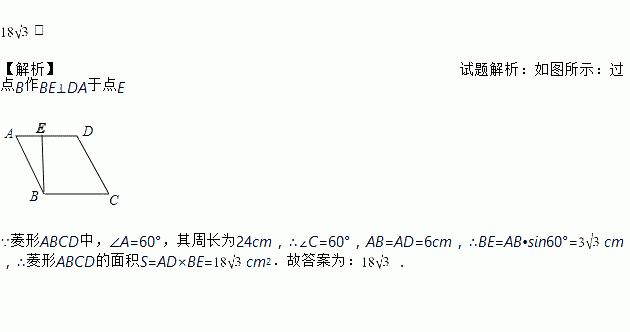 菱形ABCD中,∠A=60°,其周长为24cm,则菱形的面积为________cm2.
