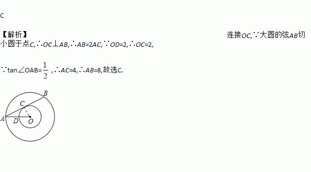 如图,以点O为圆心的两个圆中,大圆的弦AB切小圆于点C,OA交小圆于点D,若OD=2,tan∠OAB=,则AB的长是( )