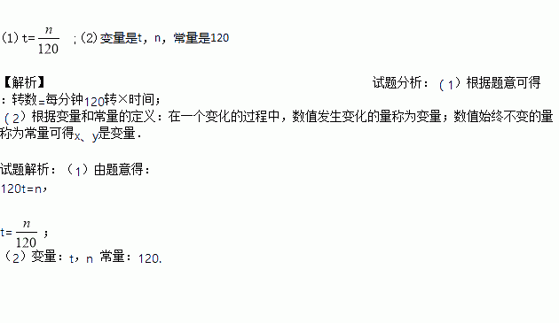 已知齿轮每分钟转120圈,如果n表示转数,t表示转动时间.