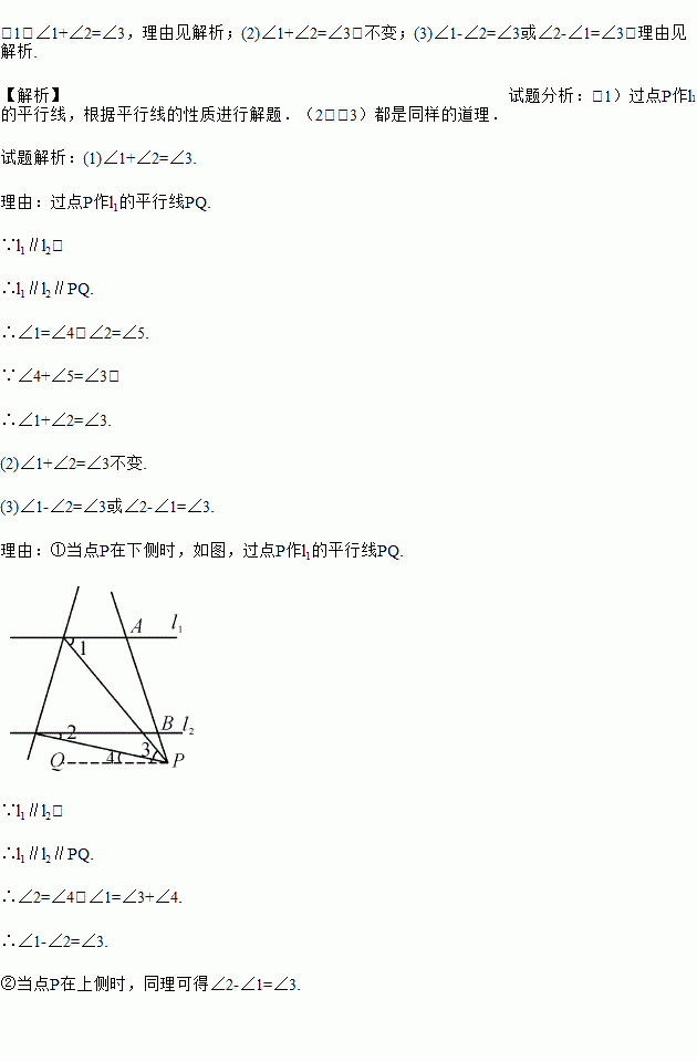 如图,已知直线l1∥l2,且l3和l1,l2分别交于A,B两点,点P在AB上.