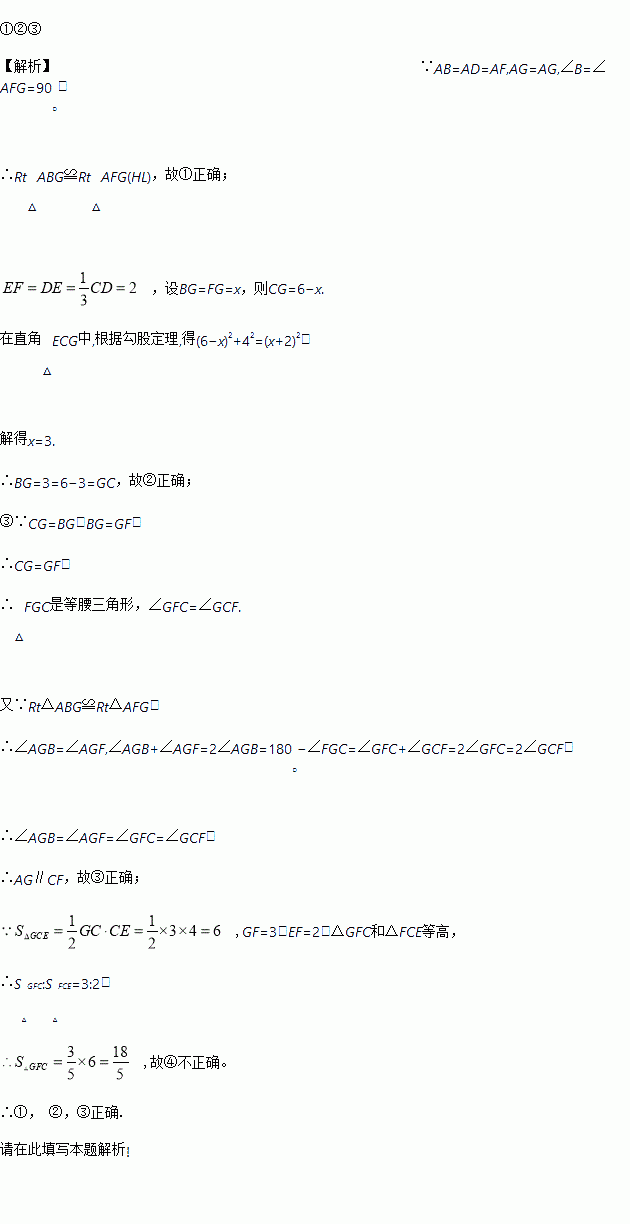 如图所示,在正方形ABCD中,AB=12,点E在CD 边上,且CD=3DE,将△ADE沿着AE 对折至△AFE, 延长EF交边BC与点G, 连接AG, CF.有下列结论:①△ABG≌△AFG ②BG=GC ③AG//CF ④S△FGC=12正确的是_____________(填序号)
