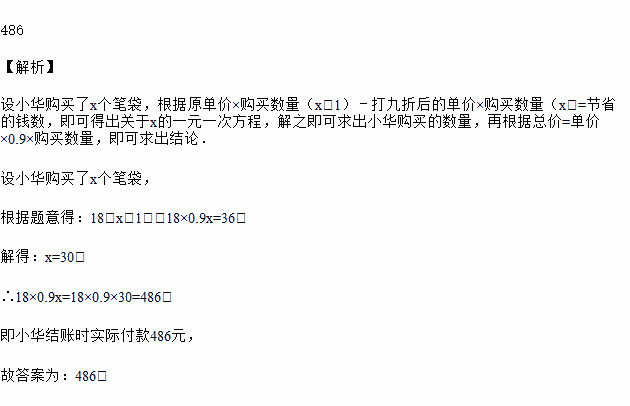 文具店销售某种笔袋,每个18元,小华去购买这种笔袋,结账时店员说:“如果你再多买一个就可以打九折,价钱比现在便宜36元”,小华说:“那就多买一个吧,谢谢,”根据两人的对话可知,小华结账时实际付款_____元.