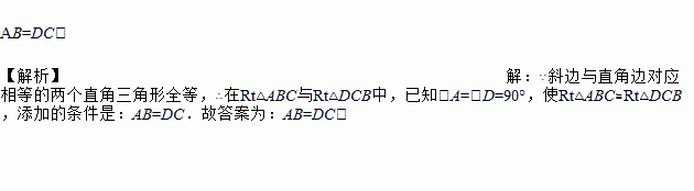 如图,在Rt△ABC与Rt△DCB中,已知∠A=∠D=90°,请你添加一个条件(不添加字母和辅助线),使Rt△ABC≌Rt△DCB,你添加的条件是______.