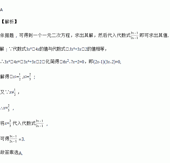 若代数式3x²-4x的值与代数式-3x²+3x-2的值相等,且x≠,则代数式的值为( )