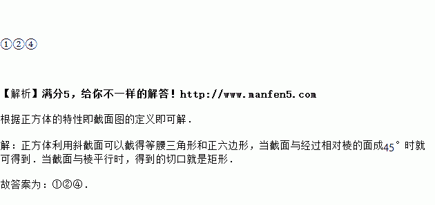 下列图形中:①等腰三角形;②矩形;③正五边形;④六边形,只有三个是可以通过切正方体(如图)而得到的切口平面图形,这三个图形的序号是________.