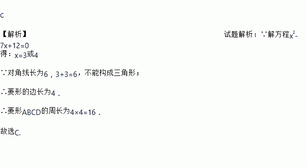 菱形ABCD的一条对角线长为6,边AB的长是方程x2-7x+12=0的一个根,则菱形ABCD的周长为( )