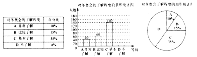 2018年平昌冬奥会在2月9日到25日在韩国平昌郡举行。为了调查中学生对冬奥会比赛项目的了解程度,某中学在学生中做了一次抽样调查,调查结果共分为四个等级:A、非常了解 B、比较了解 C、基本了解 D、不了解。根据调查统计结果,绘制了如图所示的不完整的三种统计图表。