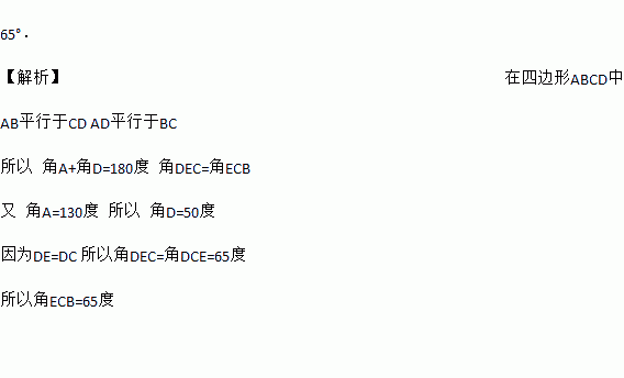 如图,在□ABCD中,∠A=130º,在AD上取DE=DC,则∠ECB的度数是 .