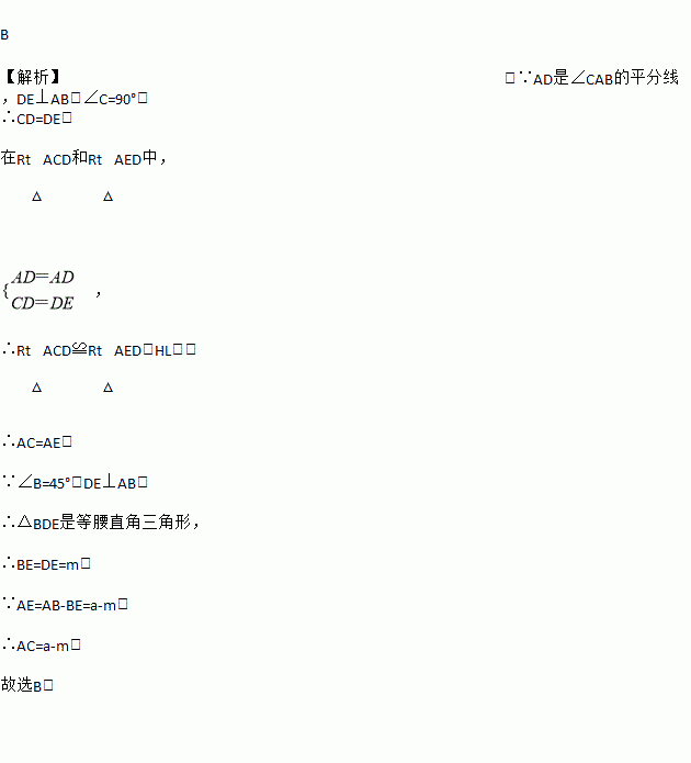 B 【解析】:∵AD是∠CAB的平分线,DE⊥AB,∠C=90°, ∴CD=DE, 在Rt△ACD和Rt△AED中, , ∴Rt△ACD≌Rt△AED(HL), ∴AC=AE, ∵∠B=45°,DE⊥AB, ∴△BDE是等腰直角三角形, ∴BE=DE=m, ∵AE=AB-BE=a-m, ∴AC=a-m. 故选B.