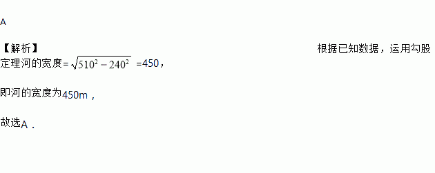 A 【解析】根据已知数据,运用勾股定理河的宽度==450, 即河的宽度为450m, 故选A.