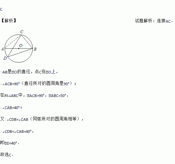 如图,已知,AB是⊙的直径,点C,D在⊙上,∠ABC=50°,则∠D为