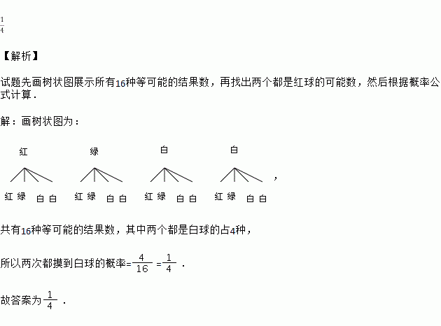 一个盒子内装有只有颜色不同的四个球,其中红球1个、绿球1个、白球2个,小明摸出一个球放回,再摸出一个球,则两次都摸到白球的概率是 .