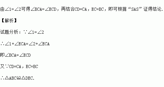 如图所示,CD=CA,∠1=∠2,EC=BC,求证:△ABC≌△DEC.