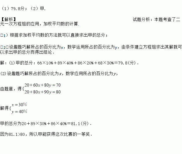 £¨1£©±ÈÈüºó£¬¼×²Â²âÆßÇÉ°åÆ´Í¼¡¢È¤ÌâÇɽ⡢ÊýѧӦÓá¢Ä§·½¸´ÔÕâËĸöÏîÄ¿µÃ·Ö·Ö±ð°´10%£¬40%£¬20%£¬30%ÕÛËã¼ÇÈë×Ü·Ö£¬¸ù¾Ý²Â²â£¬Çó³ö¼×µÄ×Ü·Ö£»