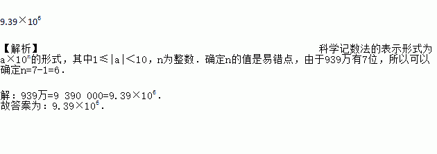 9.39×106 【解析】科学记数法的表示形式为a×10n的形式,其中1≤|a|<10,n为整数.确定n的值是易错点,由于939万有7位,所以可以确定n=7-1=6. 【解析】 939万=9 390 000=9.39×106. 故答案为:9.39×106.