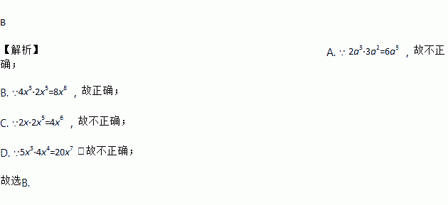 B 【解析】A. ∵ 2a3·3a2=6a5 ,故不正确; B. ∵4x3·2x5=8x8 ,故正确; C. ∵2x·2x5=4x6 ,故不正确; D. ∵5x3·4x4=20x7 ,故不正确; 故选B.