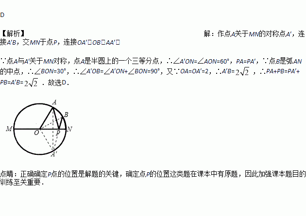 如图,点是半圆上的一个三等分点,点为弧的中点, 是直径上一动点,⊙O的半径是2,则的最小值为( )