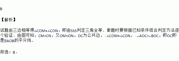 工人师傅常用角尺平分一个任意角.做法如下:如图所示,∠AOB是一个任意角,在边OA,OB上分别取OM=ON,移动角尺,使角尺两边相同的刻度分别与M,N重合.过角尺顶点C的射线OC即是∠AOB的平分线.这种做法的道理是 ( )