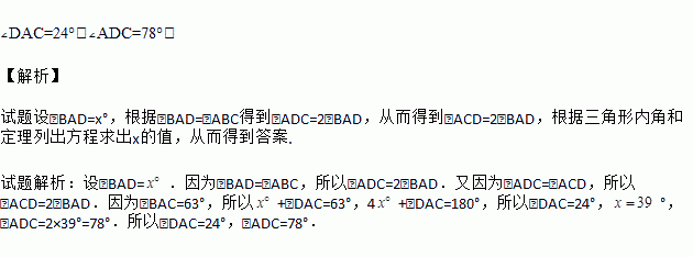 如图,在△ABC中,D为BC上一点,∠BAD=∠ABC,∠ADC=∠ACD,若∠BAC=63°,试求∠DAC、∠ADC的度数.