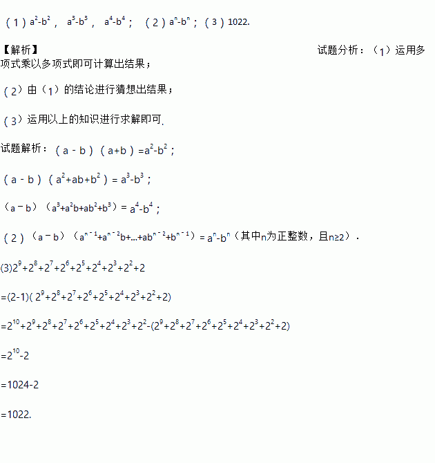 (1)a2-b2, a3-b3, a4-b4; (2)an-bn;(3)1022. 【解析】试题分析:(1)运用多项式乘以多项式即可计算出结果; (2)由(1)的结论进行猜想出结果; (3)运用以上的知识进行求解即可. 试题解析:(a﹣b)(a+b)=a2-b2; (a﹣b)(a2+ab+b2)= a3-b3; (a﹣b)(a3+a2b+ab2+b3)= a4-...