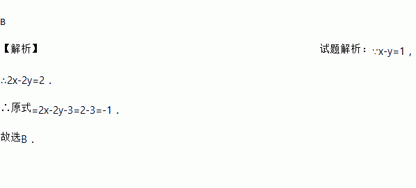 B 【解析】试题解析:∵x-y=1, ∴2x-2y=2. ∴原式=2x-2y-3=2-3=-1. 故选B.