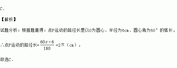如图,OA=OB=6cm,线段OB从与OA重合的位置开始沿逆时针方向旋转120°,在旋转过程中,设AB的中点为P(当OA与OB重合时,记点P与点A重合),则点P运动的路径长为( )