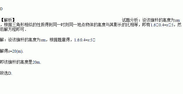 某一时刻,身髙1.6m的小明在阳光下的影长是0.4m,同一时刻同一地点测得某旗杆的影长是 5m,则该旗杆的高度是 ( )