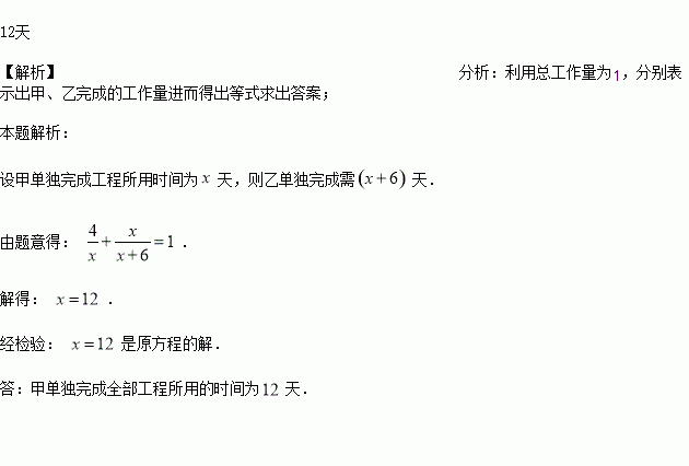某项工程如果由乙单独完成比甲单独完成多用天;如果甲、乙先合做天后,再由乙单独完成,那么乙一共所用的天数刚好和甲单独完成工程所用的天数相等.求甲单独完成全部工程所用的时间.