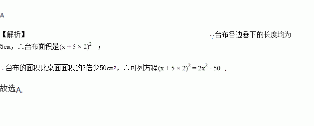 在一张正方形桌子的桌面上放上一块台布,台布各边垂下的长度均为5cm,台布的面积比桌面面积的2倍少50cm2,若设正方形桌面的边长为