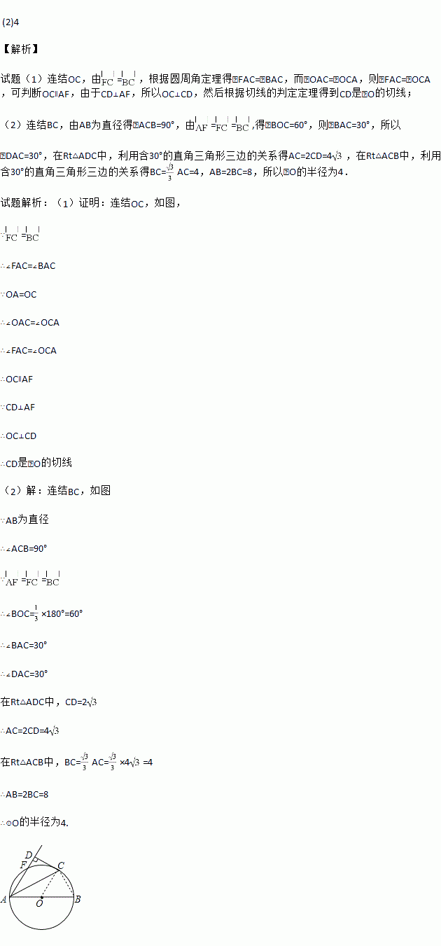 如图,AB是⊙O的直径,点F,C是⊙O上两点,且,连接AC,AF,过点C作CD⊥AF交AF延长线于点D,垂足为D.