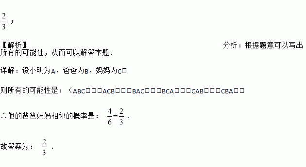 小明和他的爸爸、妈妈共3人站成一排拍照,他的爸爸、妈妈相邻的概率是____________.