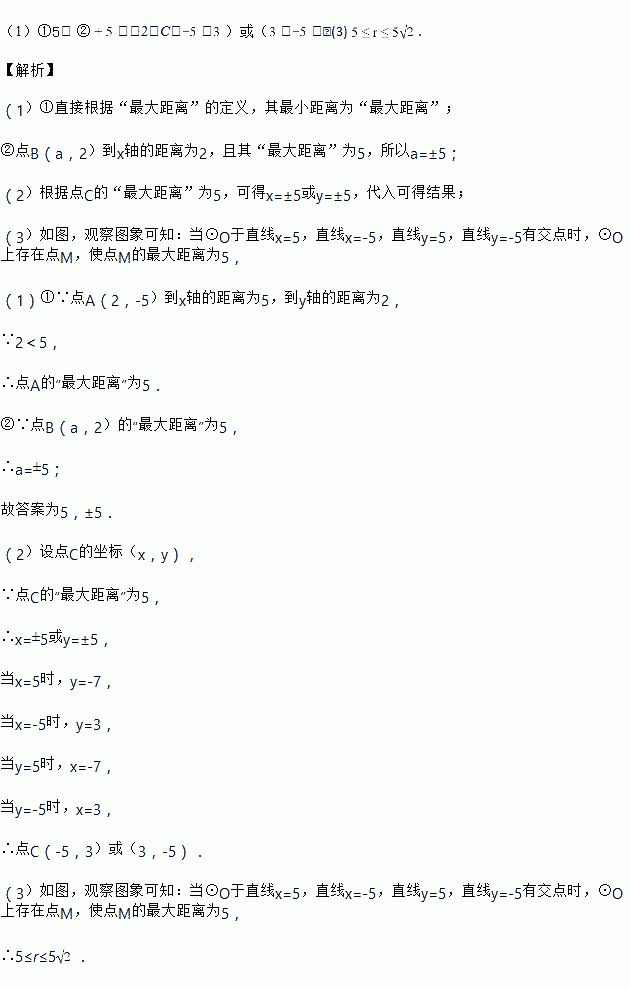 (3)若⊙O上存在点M,使点M的最大距离为,直接写出⊙O的半径r的取值范围.![]()