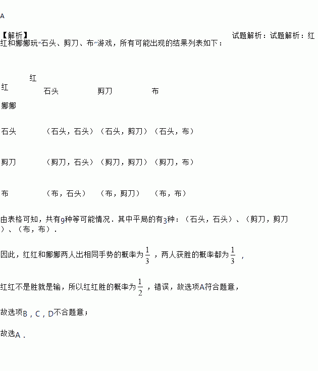 红红和娜娜按如图所示的规则玩一次“锤子、剪刀、布”游戏,下列命题中错误的是( )