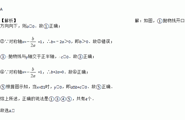 二次函数y=ax2+bx+c(a≠0)的图象如图所示,对于下列结论:①a<0;②b<0;③c>0;④2a+b=0;⑤a﹣b+c<0,其中正确的个数是( )