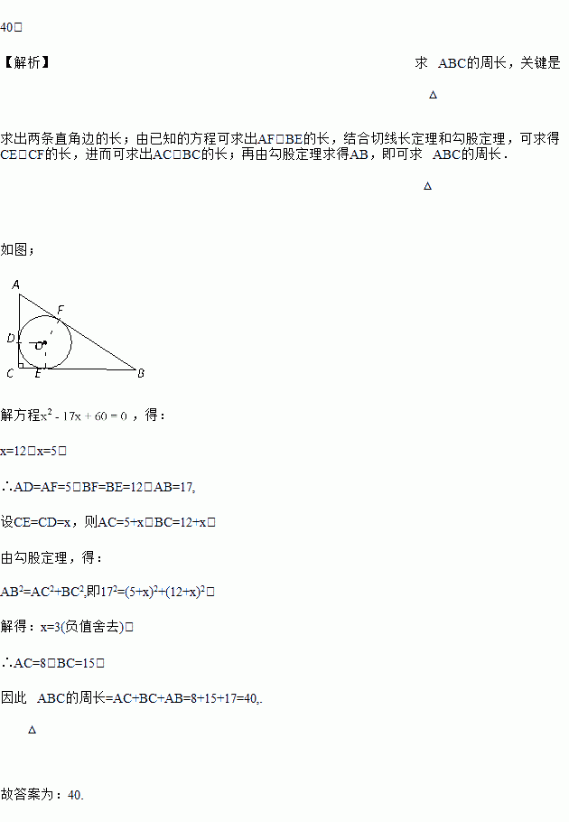 如图,⊙O是△ABC的内切圆,切点为D,E,F,若AD、BE的长为方程的两个根,则△ABC的周长为 ______.