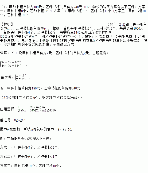 £¨2£©Èô¸ÃУ¼Æ»®¹º½øÕâÁ½ÖÖ¹æ¸ñµÄÊé¹ñ¹²20¸ö£¬ÆäÖÐÒÒÖÖÊé¹ñµÄÊýÁ¿²»ÉÙÓÚ¼×ÖÖÊé¹ñµÄÊýÁ¿£¬Ñ§Ð£ÖÁ¶àÄܹ»Ìṩ×ʽð4320Ôª£¬ÇëÉè¼Æ³öËùÓйºÂò·½°¸¹©Õâ¸öѧУѡÔñ£®